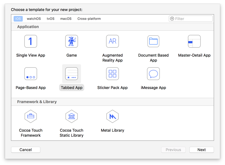- 新建一个iOS的项目,打开XCode,新建一个项目,选择Tabbed App