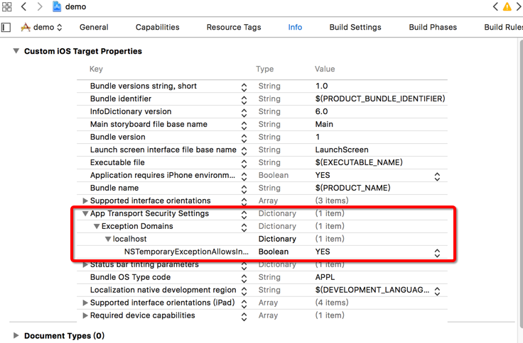 func application(_ application: UIApplication, didFinishLaunchingWithOptions launchOptions: [UIApplicationLaunchOptionsKey: Any]?) -> Bool { // Override point for customization after application launch. var tab = self.window?.rootViewController as! UITabBarController let jsCodeLocation = URL(string: "http://localhost:8081/index.bundle?platform=ios") let rootView = RCTRootView( bundleURL: jsCodeLocation, moduleName: "ReactNativeProject", initialProperties: nil, launchOptions: nil ) let vc = UIViewController() vc.view = rootView vc.title = "rn" tabbar.viewControllers?.append(vc) return true } - 设置允许localhost的http访问
