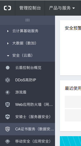 - 首先登录阿里云的控制台,选择“安全(云盾)”目录下的CA证书服务